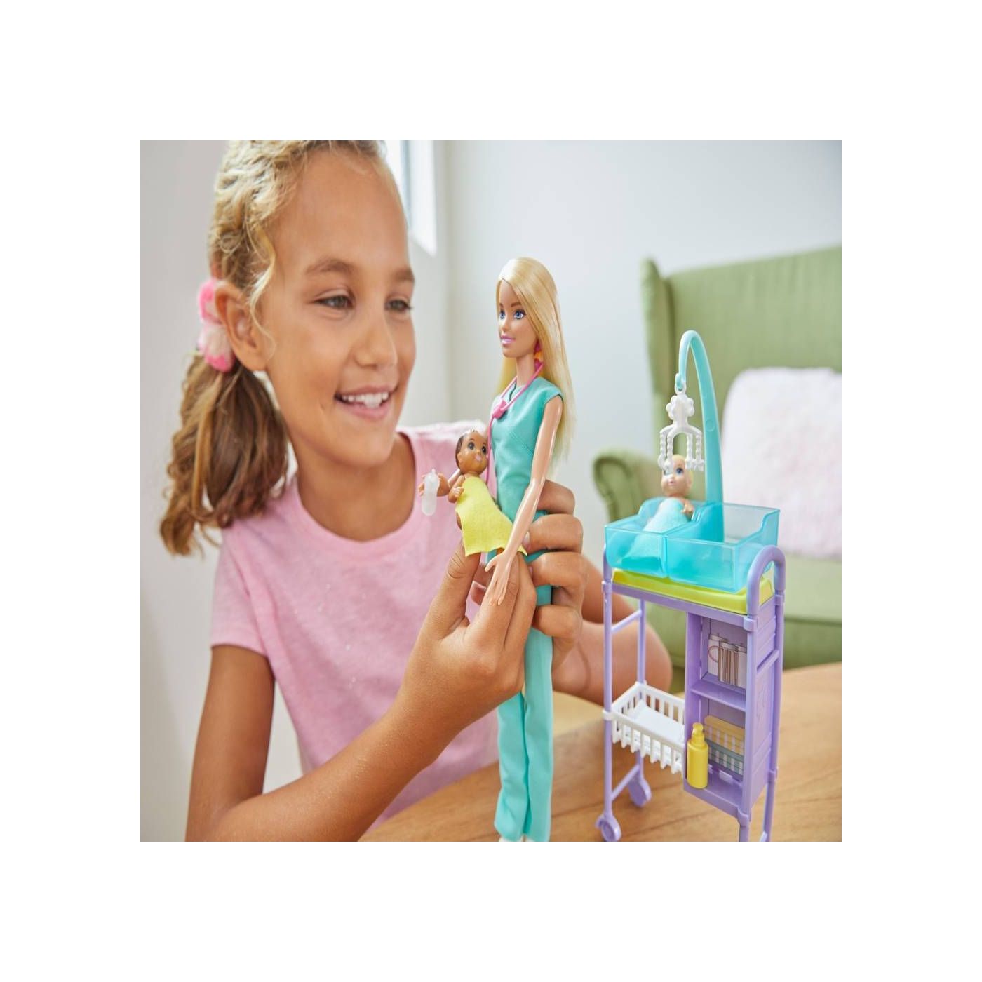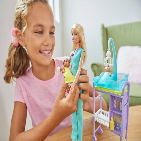 Incercati noi cariere cu seturile Barbie. De la medicina, sport si invatamant acum putem crea scenarii nelimitate cu aceste seturi de joaca. Fiecare se vinde separat, in functie de disponibilitate. Culorile si decoartiunile pot varia. Papusa Barbie Medic Pediatru Mattel, un set de joaca Barbie Doctorita de copii marca Mattel.Exploreaza lumea magica a medicinei cu setul de joaca Papusa Barbie. Jucarie Papusa Barbie este imbracata in halat verde de doctor pediatru cu saboti albi , are par lung blond , ochi albastrii si este pregatita sa consulte micutii pacienti.La gat are un stetoscop , accesoriu indispensabil pentru orice doctor care consulta pacienti.Setul de joaca include doi bebelusi adorabili in scaune , masa de consultatii , sticlute pentru lapte si apa.
