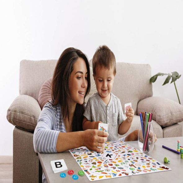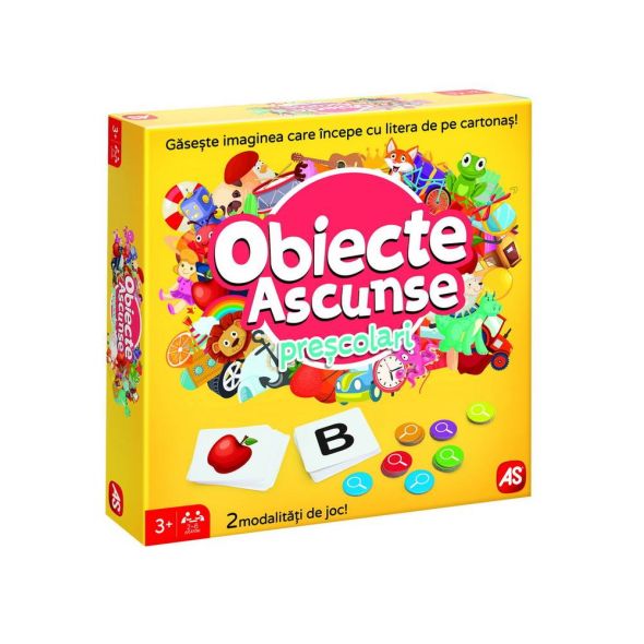 Jocul ideal de observare pentru prescolari! Cu 2 moduri de joc gasiti obiectul care incepe cu litera de pe cartonas si gasiti obiectul de pe cartonas pe tabla de joc. Cu cat gasesti mai repede obiectul, cu atat mai repede vei scapa de jetoanele din posesia ta. Cine ramane primul fara jetoane, CÂsTIGa!Valorile educationale ale jocului coordonarea mana-ochi, atentie, corelatia imagine-cuvant.Jocul contine 4 planse cu doua fete care creeaza suprafata de joc, 24 de carti cu doua fete, 48 jetoane de 6 culori, manual de instructiuni Varsta recomandata 3 ani +.
