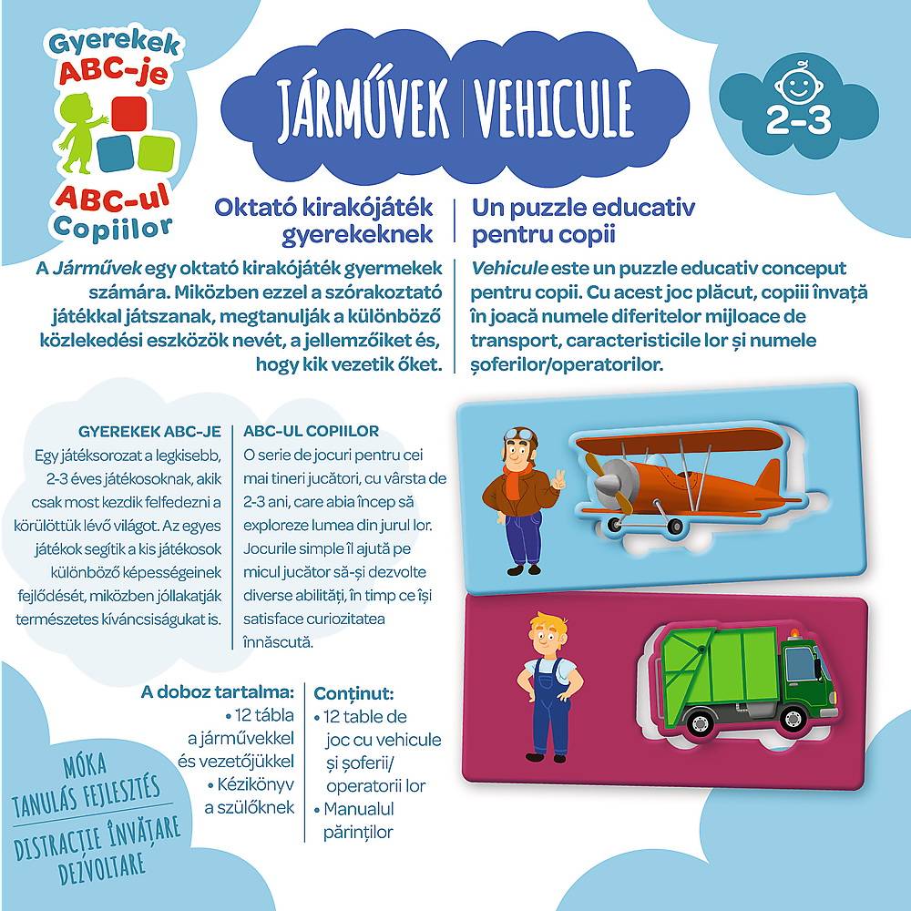 Jocul de masa Vehicule va va ajuta copilul sa-si reinnoiasca cunostintele despre vehicule si sa completeze vocabularul. Jocul ofera 7 scenarii diferite de joc. Copilul se poate juca singur, cu parintii sau cu prietenii. Cea mai simpla versiune a jocului implica potrivirea cartilor mici cu imaginile peisajului, apoi puteti juca la viteza, memora, crea istorii noi si intreba ghicitori legate de vehicule.