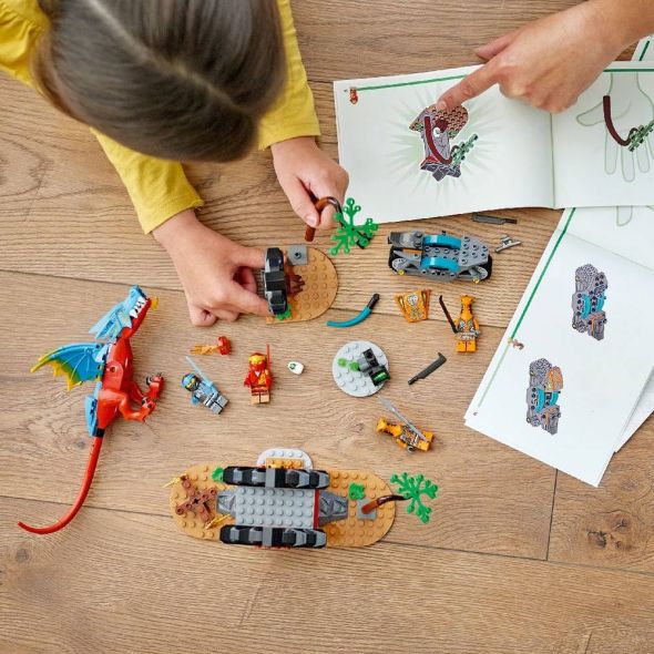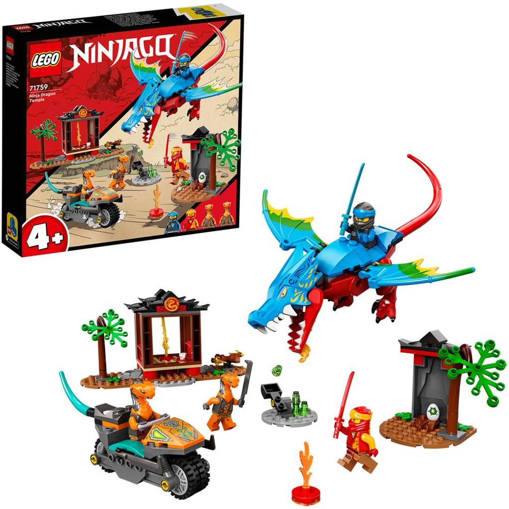 LEGO NINJAGO Templul Dragonului (71759) ajuta copiii de 4+ ani sa isi dezvolte abilitatile de constructie. Include un dragon articulat, 2 temple ninja, 2 copaci articulati, un ou de dragon si 4 minifigurine ninja Kai si Nya si inamicii Cobra Mechanic si Sneaky Snake.Acest set de joaca cu ninja a fost creat special pentru a da copiilor cu varste de 4+ ani o experienta de constructie si joaca sclipitoare. In cutie, fiecare punga de piese include un model de construit si un personaj de construit, astfel copiii pot da drumul actiunii cat mai repede. Setul contine si o caramida de baza pentru incepatori pentru a ajuta copiii sa inceapa constructia dragonului.Setul include instructiuni digitale interactive care vor face experienta de constructie si mai distractiva. Disponibile in aplicatia gratuita LEGO Building Instructions pentru telefon si tableta, ele dispun de functii de zoom si rotire pentru ca cei mici sa poata vizualiza modelul in timp ce il construiesc.Set LEGO pentru incepatori Setul LEGO NINJAGO Templul Dragonului (71759) le permite copiilor de 4+ ani sa isi dezvolte abilitatile de constructie cu o experienta distractiva si satisfacatoare.4 minifigurine include ninja Kai si Nya, un Sneaky Snake pe o motocicleta si un Cobra Mechanic cu o sulita si o catapulta, asa ca micii constructori pot juca aventuri pe roluri.Dragon de jucarie capul, coada si aripile dragonului sunt articulate, iar acesta se poate construi foarte usor si rapid cu ajutorul caramizii de baza pentru incepatori.Acest set cu 161 de piese este un cadou minunat pentru copiii de 4+ ani.Dragonul masoara peste 9 cm inaltime, 23 cm lungime si 16 cm latime.