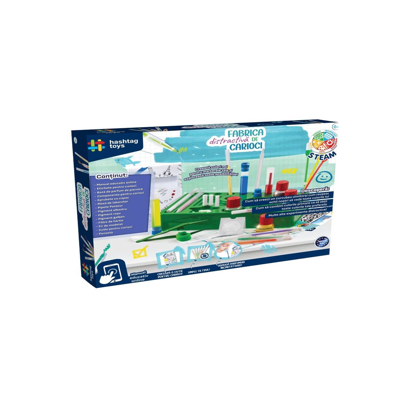 Iti place sa pictezi, sa desenezi si sa-ti lasi imaginatia libera? Avem jucaria perfecta pentru tine SET FABRICA DISTRACTIVA DE CARIOCI. Cu acest set, poti invata cum sa creezi propriii markeri. Vei descoperi si cum sa faci markere care isi schimba culoarea, parfumate sau cu cerneala invizibila. Invata sa amesteci culori si exploreaza toate posibilitatile acestei &bdquofabrici de culori&rdquo! Poti chiar sa creezi si sa personalizezi propria cutie de markere. Continutul kitului etichete pentru carioci, piese pentru carioci, varf, corp, capac, sigiliu, filtru, cutie pentru carioci, sarma modelatoare, pipete Pasteur, penseta, pigment galben, pigment albastru, pigment rosu, filtre de hartie, eprubete cu capace, masa de laborator.