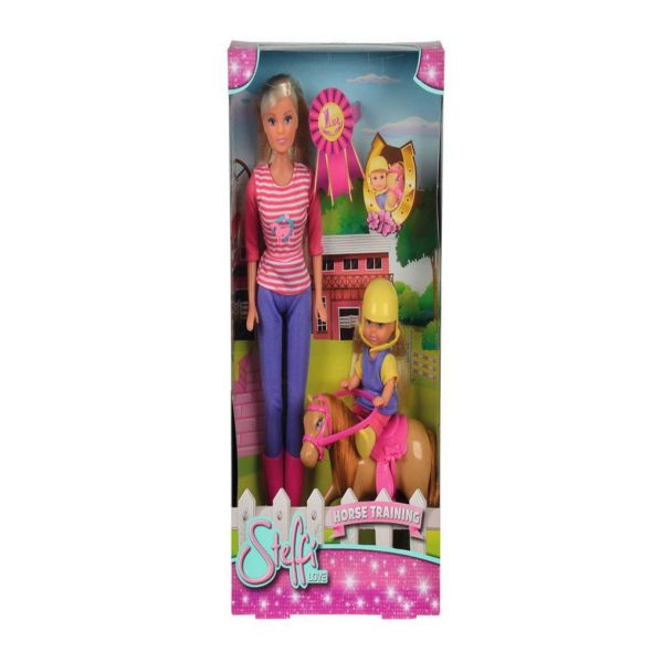 Papusi manechin de 29 si 12 cm, impreuna cu un ponei cu par real foarte frumos aranjat. Papusile Steffi si Evi se intalnesc pentru o sesiune de calarie ! Papusi manechin 29cm si 12cm Steffi se pregateste pentru rolul ei de instructor de calarie. Ea va putea sa o invete pe Evi sa calareasca un ponei ! Setul contine 1 ponei, casca de protectie, 1 sa si cele 2 papusi.