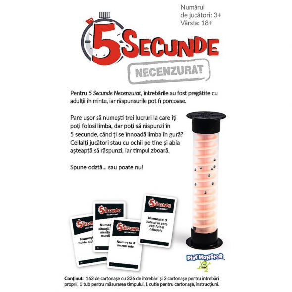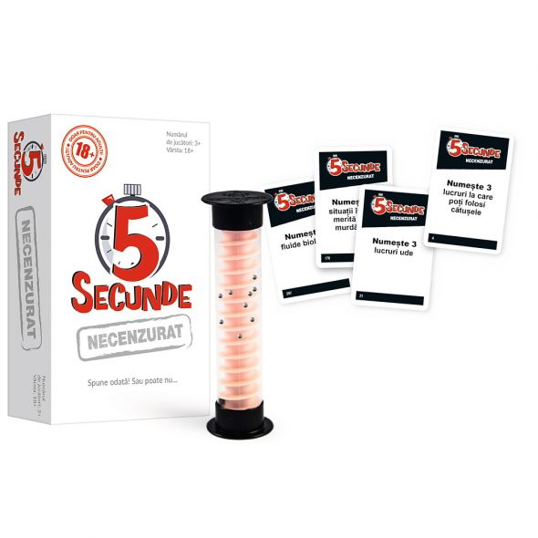 Pentru 5 Secunde Necenzurat, intrebarile au fost pregatite cu adultii in minte, iar raspunsurile pot fi porcoase. Pare usor sa numesti trei lucruri la care iti poti folosi limba, dar poti sa raspunzi in 5 secunde, cand ti se innoada limba in gura? Ceilalti jucatori stau cu ochii pe tine si abia asteapta sa raspunzi, iar timpul zboara. Spune odata.. sau poate nu!