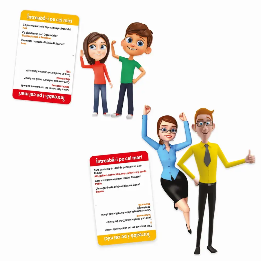 Cel mai distractiv joc de cunostinte generale pentru copii si parinti! Cu doua categorii de intrabari, familia este gata de confruntare. Raspunzand la intrebari de cultura generala, copiii au sansa de a demonstra ca oul e mai destept decat gaina! Prin raspunsuri corecte la intrebarile de pe cartonasele de joc, fiecare echipa va inainta pe tabla de joc. Aveti grija la pozitiile BONUS sau PEDEAPSA, pentru ca va pot ajuta sa inaintati, sau va pot intoarce cateva pozitii pe tabla de joc. Echipa care care ajunge prima la linia de Finish castiga! Jocul contine tabla de joc, 110 cartonase de joc cu 660 de intrebari, 2 pioni si instructiuni de joc. Varsta 7+. Jucatori 2+.