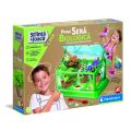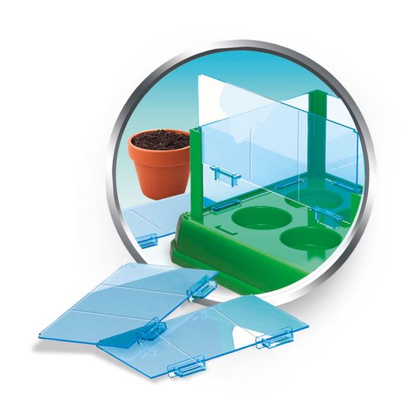 Continutul setului componentele de plastic( baza, coloane de sustinere, pereti transparenti, acoperis) a serei, ghivece biodegradabile, turba, paharut cu capac, pipeta, spatula, penseta, seminte biologice si un manual de instructiuni pentru experimente sigure explicate pas cu pas.