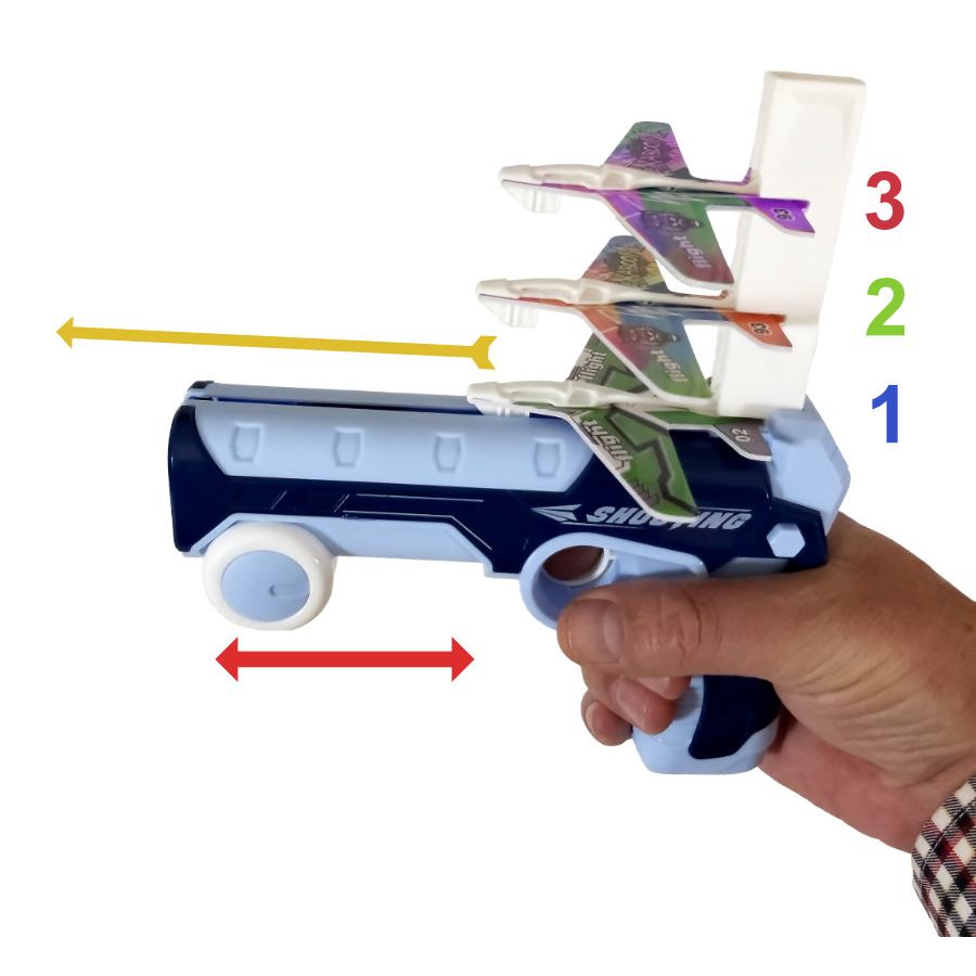 Se aseaza cele 4 avioane in locasurile speciale, se armeaza pistolul si se lanseaza primul avion. Apoi, se apasa pe incarcator, aducand in pozitie de tragere al doilea avion. Se armeaza, din nou, pistolul si se lanseaza cel de al doilea avion. Se repeta manevrele pana la lansarea celui de al patrulea avion.