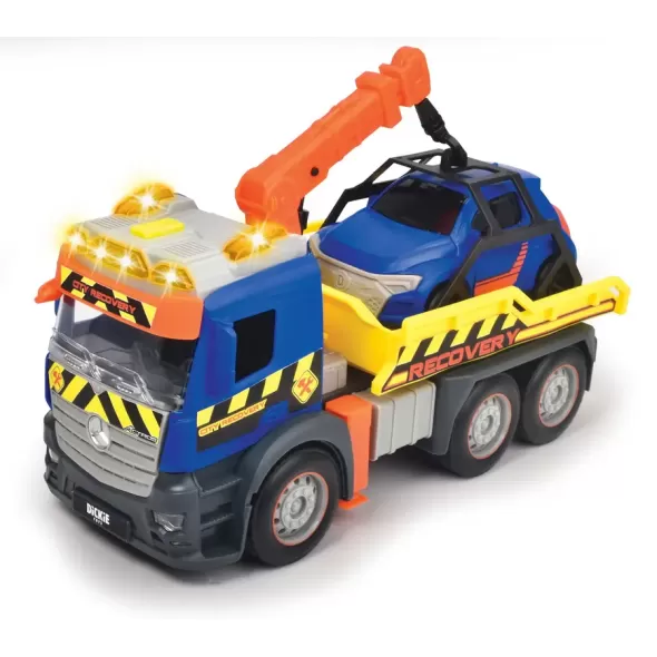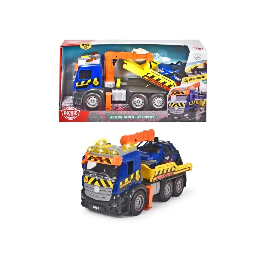 Masina de tractari, cu sunete, lumini si parti mobile, cu licenta Mercedes. Setul include si 1 masinuta cu lungimea de 12 cm. Lungime 26 cm.Vehicul de recuperare cu masina de jucarie, brat de macara, sunet si lumina de avertizare, pentru copii cu varsta de peste 3 ani.Acest camion de recuperare de la Dickie Toys este plin de caracteristici Vehiculul puternic poate incarca masinile fara efort pe platforma sa mobila si le poate remorca pana la cel mai apropiat garaj de reparatii.Acest camion de jucarie ii permite micutului tau sa se cufunde in lumea unui mecanic de depanare. Înainte ca masina sa poata fi incarcata pe camion, camionul trebuie sa se apropie suficient pentru a se asigura ca bratul macaralei poate ajunge la vehicul. De asemenea, coloanele de sustinere trebuie sa fie pliate pentru a se asigura ca camionul ramane stabil. Daca masina inca se poate misca, se poate folosi rampa pliabila.Camionul este modelat dupa un Mercedes Actros si are o sigla mare Mercedes. Are, de asemenea, un motor de frecare incorporat, care propulseaza vehiculul la cativa metri atunci cand este impins. Nu uitati sa vedeti celelalte doua vehicule din aceasta gama, Dickie Toys Garbage (203745014) si Dickie Toys Recycling Truck (203745015).