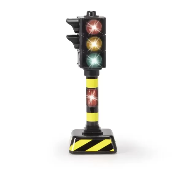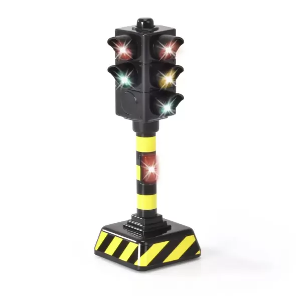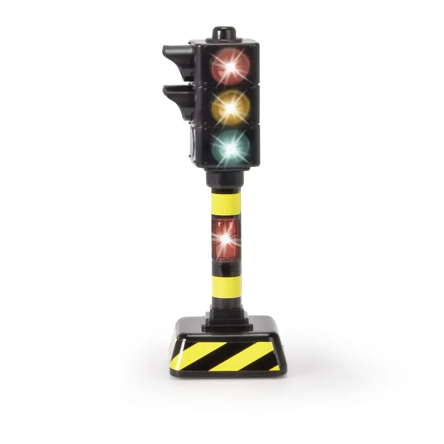Semafor functional, cu sunete si lumini, inaltime 12 cm. Aflati despre siguranta rutiera cu semafoarele de jucarie Dickie Toys! Haos in orasul jucariilor papusa vrea sa traverseze drumul, dar un camion si o masina asteapta la intersectie cine are dreptul de trecere? Cu semafoarele de jucarie Dickie Toys, micutul tau poate controla traficul si poate invata despre functiile semafoarelor. Semafoarele de 12 cm isi schimba culoarea automat pentru a da semnal soferilor si pietonilor, la fel ca in viata reala! Pe langa schimbarea automata a culorii, semafoarele prezinta si efecte sonore tipice si vin cu baterii (2x 1,5 V LR44).