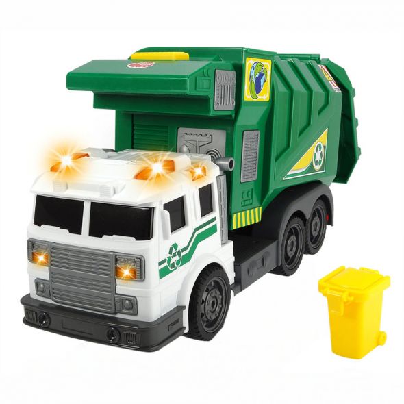 Masina de jucarie reproduce in detaliu procesele cunoscute ale vehiculelor rutiere reale: containerul de deseuri asociat se deplaseaza in sus si in jos pe dispozitivul lateral si continutul se revarsa in groapa de gunoi.